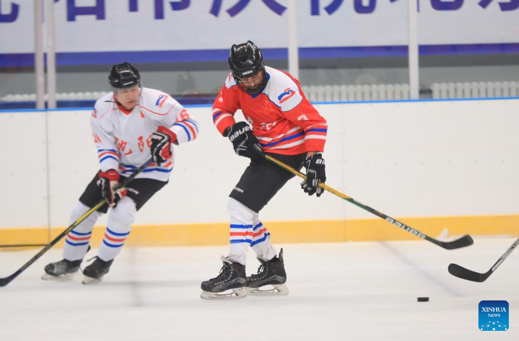 Ryan (R) plays ice hockey with friends in Shenyang, northeast China's Liaoning Province, Jan. 6, 2022. Ryan is a 38-year-old Canadian living in Shenyang. Ryan came to China for the first time in 2013 and now works as an engineer at a company in Shenyang. Ryan is an enthusiast devoted to winter sports, especially ice hockey. Through weekly training in ice hockey, Ryan made friends with many local ice hockey lovers. As the 2022 Beijing Olympics approaches, Ryan is looking forward to a great performance from all the athletes. He wishes the Beijing Winter Olympics a great success. (Xinhua/Yang Qing)