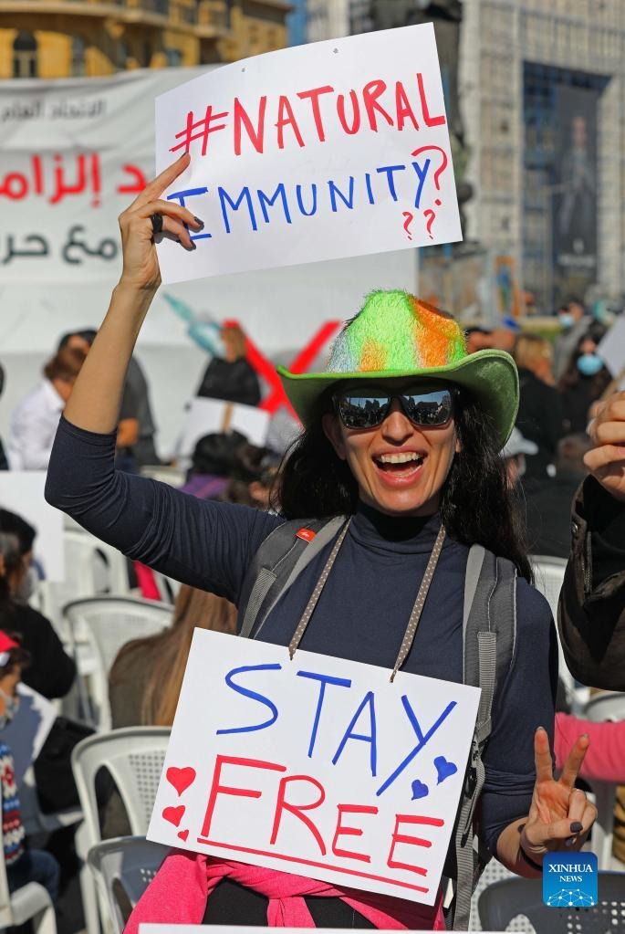 A protester holds a placard at Martyrs' Square in central Beirut, Lebanon on Jan. 8, 2022. Dozens of Lebanese gathered at Martyrs' Square in central Beirut, Lebanon on Saturday, refusing to have vaccinations and demanding freedom of choice amid surge in COVID-19 cases in the country. Meanwhile, with 7,547 new COVID-19 cases registered nationwide on Saturday, the COVID-19 Omicron wave that started three weeks ago in Lebanon has turned into a "tsunami," warned the country's Health Minister Firas Abiad. The national tally now stood at 769,400, and 17 more people died from the disease, bringing the country's death toll to 9,267, the ministry reported. (Xinhua/Bilal Jawich)