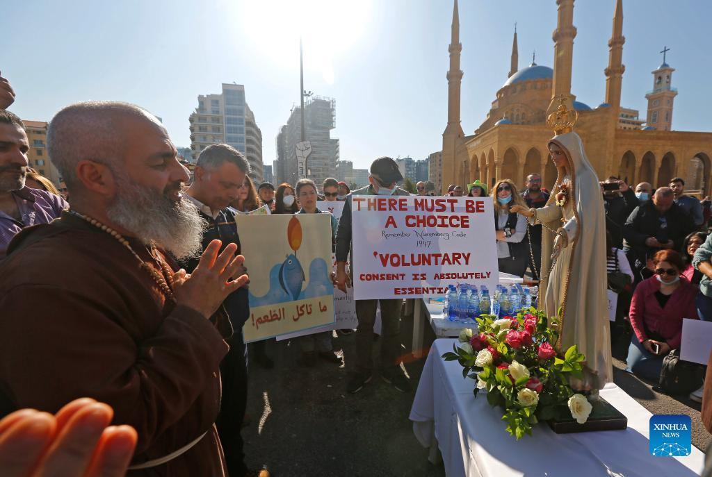 A clergyman prays with people who refuse compulsory vaccination in Beirut, Lebanon, on Jan. 8, 2022. Dozens of Lebanese gathered at Martyrs' Square in central Beirut, Lebanon on Saturday, refusing to have vaccinations and demanding freedom of choice amid surge in COVID-19 cases in the country. Meanwhile, with 7,547 new COVID-19 cases registered nationwide on Saturday, the COVID-19 Omicron wave that started three weeks ago in Lebanon has turned into a "tsunami," warned the country's Health Minister Firas Abiad. The national tally now stood at 769,400, and 17 more people died from the disease, bringing the country's death toll to 9,267, the ministry reported. (Xinhua/Bilal Jawich)