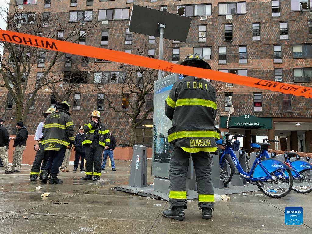 Firefighters are seen in front of the apartment building in Bronx, New York, the United States, on Jan. 9, 2022. At least 19 people, including nine children, lost their lives in a major fire in New York City on Sunday, various U.S. media outlets reported. (Photo by Michael Nagle/Xinhua)