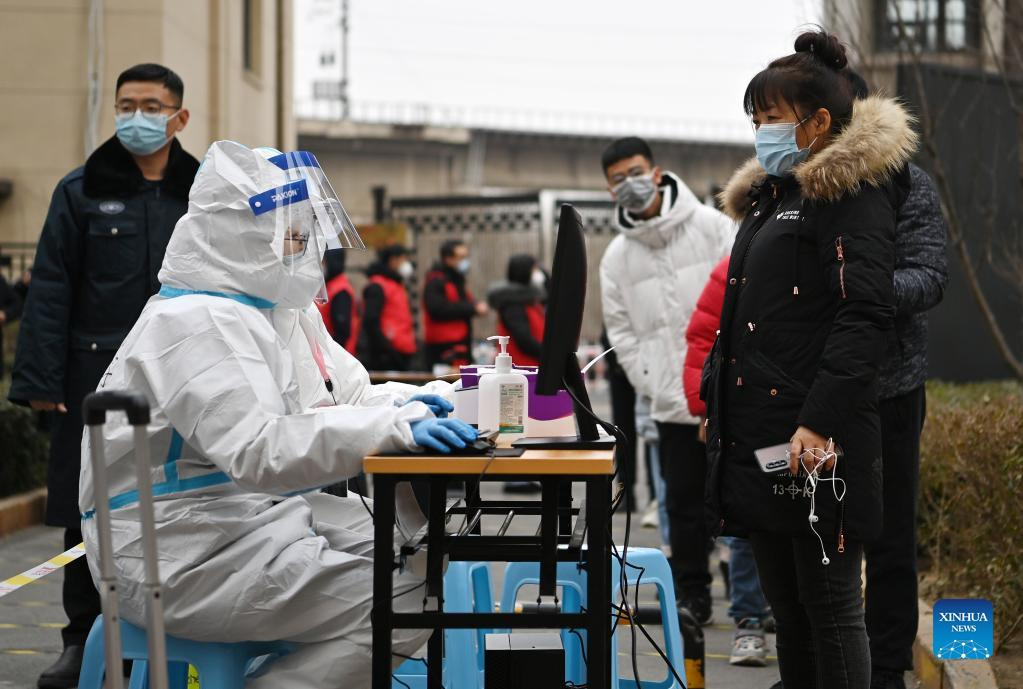 Citizens line up for registration before nucleic acid test at a testing site of a residential area in Xiqing District in north China's Tianjin, Jan. 9, 2022. North China's Tianjin, a municipality that neighbors Beijing, has decided to start a citywide nucleic acid testing after 20 people tested positive for COVID-19, authorities said Sunday. The infections were reported from 6 p.m. Friday to 9 p.m. Saturday in Jinnan District, and the gene sequencing found the first two locally transmitted confirmed cases were infected with the VOC/Omicron variant, according to the municipal headquarters for COVID-19 prevention and control. (Xinhua/Li Ran)