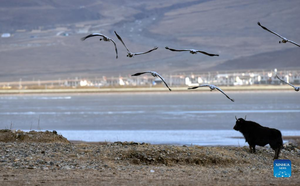 Black-necked cranes fly in Lhunzhub County of Lhasa, southwest China's Tibet Autonomous Region, Jan. 8, 2022. The population of black-necked crane is estimated to reach nearly 10,000 in Tibet, according to the regional department of ecology and environment. (Xinhua/Huang Huo)