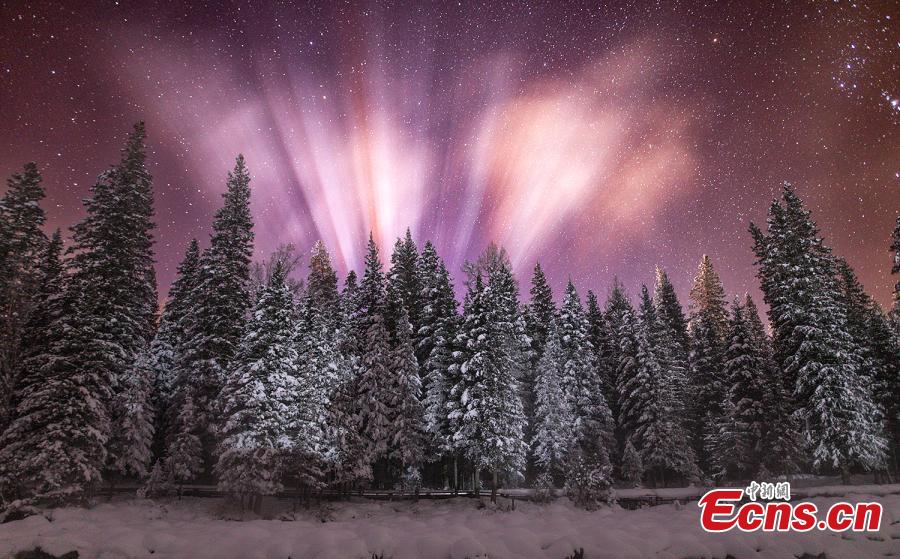 Photo shows the colored light pillars in Kanas scenic area of Altay, northwest China's Xinjiang Uyghur Autonomous Region. (Photo: China News Service/Cai Shi)