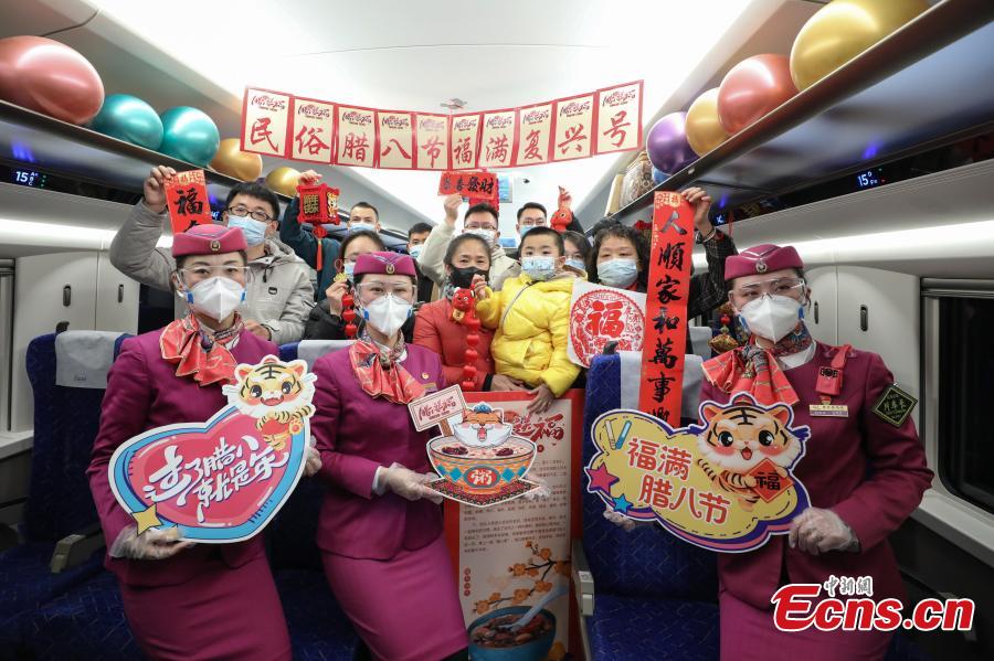 Passengers and train attendants on Fuxing EMU (C5980) take a group photo, Bijie, January 9, 2022. (Photo: China News Service/Qu Honglun)