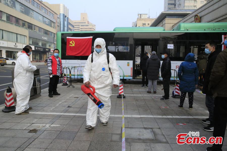 A medical worker disinfects the environment around the bus in Zhengzhou, Henan Province, Jan. 9, 2022. (Photo: China News Service/Zhu Manjie)