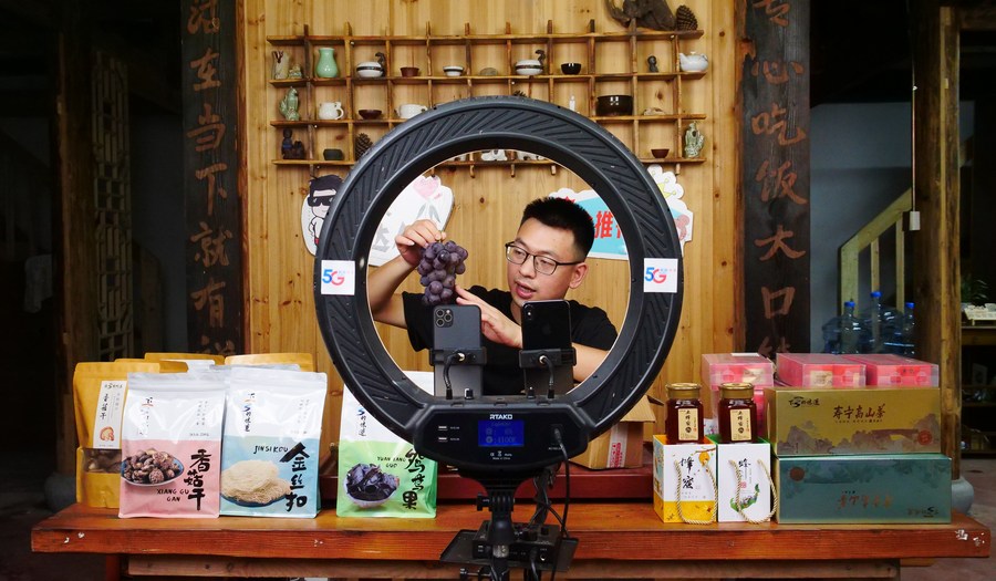 A man promotes grapes at his live streaming room in Xiadang Township of Ningde, southeast China's Fujian Province, Aug. 17, 2021. (Xinhua/Zhou Yi)