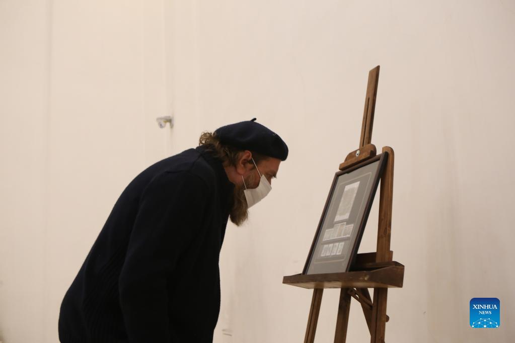 Ahmad Mohit Tabatabai, president of Iran's National Committee of Museums, visits an exhibition of Chinese and Iranian stamps in Tehran, Iran, on Jan. 10, 2022. (Xinhua/Gao Wencheng)