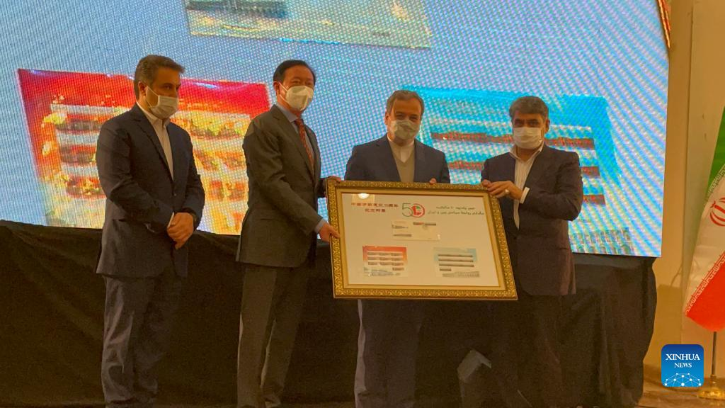 Chinese Ambassador to Iran Chang Hua (2nd L) and Iran's Deputy Minister of Communication and Information Technology Ramezanali Sobhanifar (1st R) display commemorative stamps to celebrate the 50th anniversary of the establishment of diplomatic relations between the two countries in Tehran, Iran, on Jan. 10, 2022. (Xinhua/Gao Wencheng)