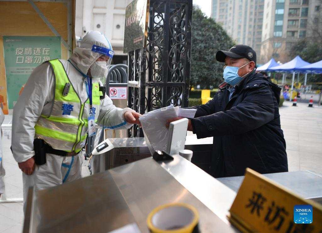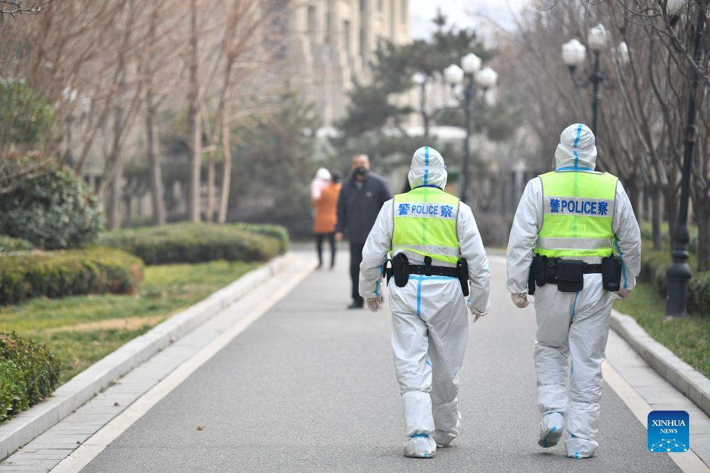 Policemen in protective gears patrol in a community in Xi'an, capital of northwest China's Shaanxi Province, Jan. 10, 2022. Monday marks the second Chinese People's Police Day. It falls every Jan. 10, corresponding with the country's emergency call number of 110. Policemen in Xi'an stick to their posts on the day to secure the COVID-19 epidemic prevention and control. (Xinhua/Zhang Bowen)