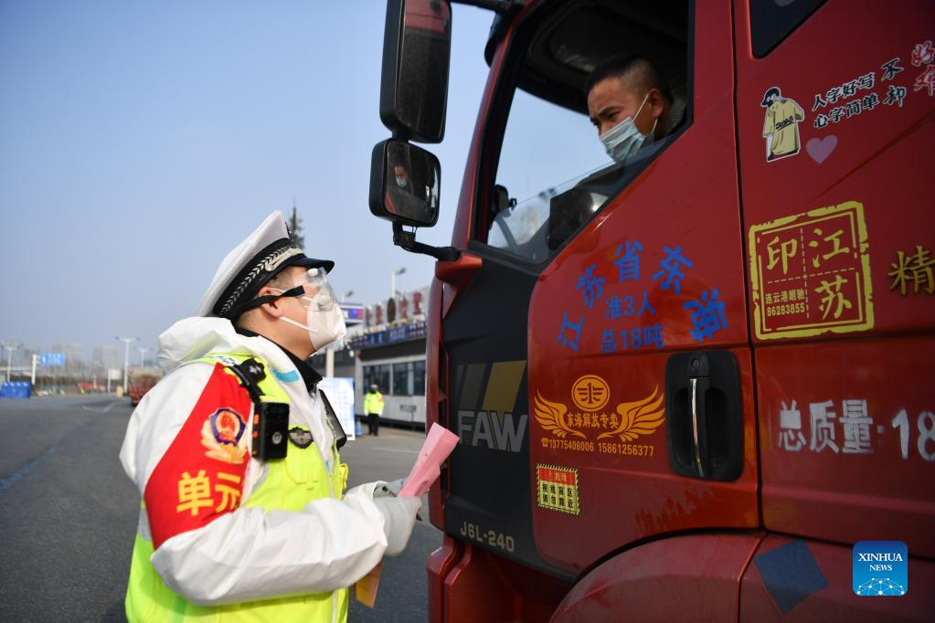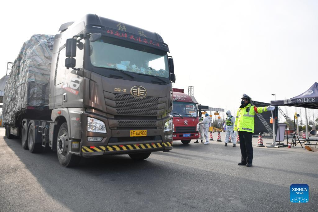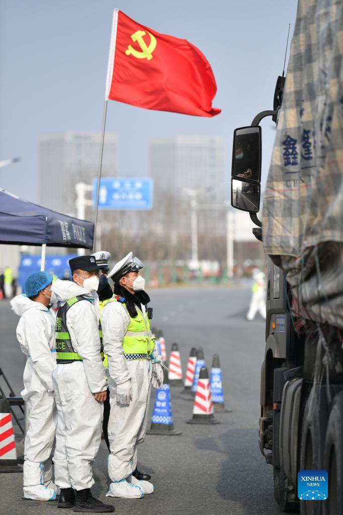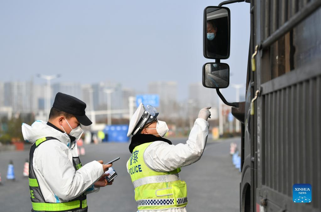 A policeman conducts vehicles to pass at a tollgate in Xi'an, capital of northwest China's Shaanxi Province, Jan. 10, 2022. Monday marks the second Chinese People's Police Day. It falls every Jan. 10, corresponding with the country's emergency call number of 110. Policemen in Xi'an stick to their posts on the day to secure the COVID-19 epidemic prevention and control. (Xinhua/Zhang Bowen)