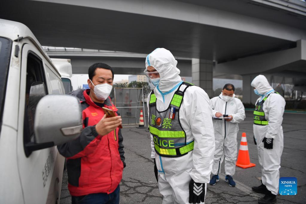 Policemen in protective gears are on duty at a tollgate in Xi'an, capital of northwest China's Shaanxi Province, Jan. 10, 2022. Monday marks the second Chinese People's Police Day. It falls every Jan. 10, corresponding with the country's emergency call number of 110. Policemen in Xi'an stick to their posts on the day to secure the COVID-19 epidemic prevention and control. (Xinhua/Zhang Bowen)