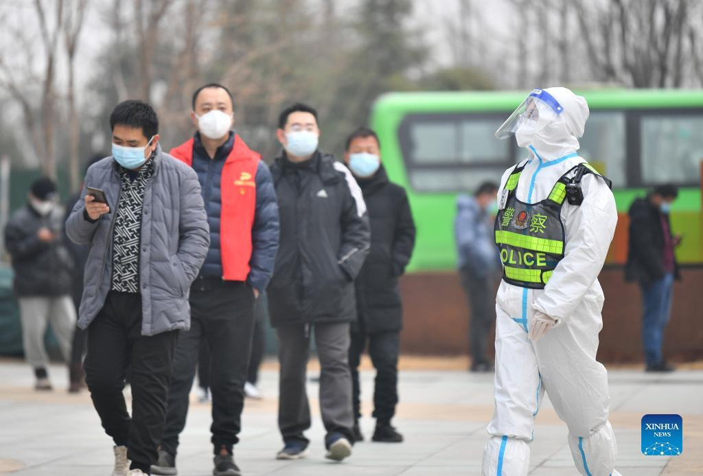 A policeman in protective gear patrols at a COVID-19 testing site in Xi'an, capital of northwest China's Shaanxi Province, Jan. 10, 2022. Monday marks the second Chinese People's Police Day. It falls every Jan. 10, corresponding with the country's emergency call number of 110. Policemen in Xi'an stick to their posts on the day to secure the COVID-19 epidemic prevention and control. (Xinhua/Zhang Bowen)