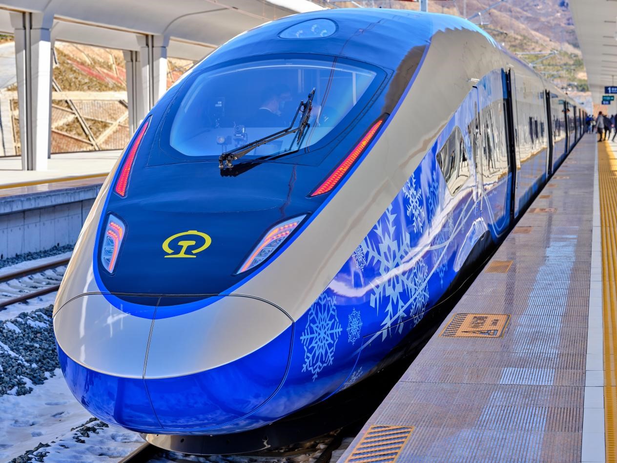The first train custom-made for the Beijing Winter Olympics sets off from Qinghe Railway Station in Beijing on the high-speed railway linking Beijing and Zhangjiakou, the co-host cities of the 2022 Winter Games, Jan. 6, 2022. (People’s Daily Online/ Shi Wenzhe)