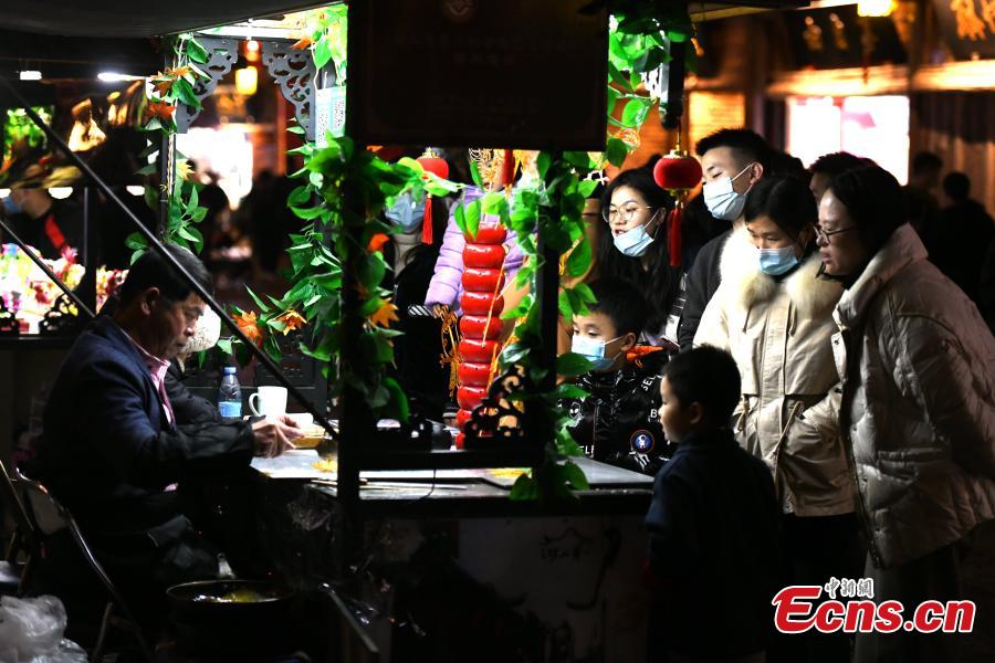 People are attracted by sugar painting, a?form of traditional Chinese folk art, at a store of the ancient street in Fuzhou, capital of China’s Fujian Province, Jan. 8, 2022. (Photo: China News Service/Wang Dongming)