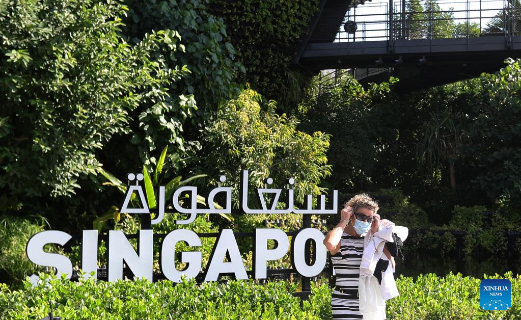 A tourist poses for photos in front of the Singapore Pavilion of the Expo 2020 Dubai in Dubai, the United Arab Emirates, on Jan. 11, 2022. (Xinhua/Wang Dongzhen)