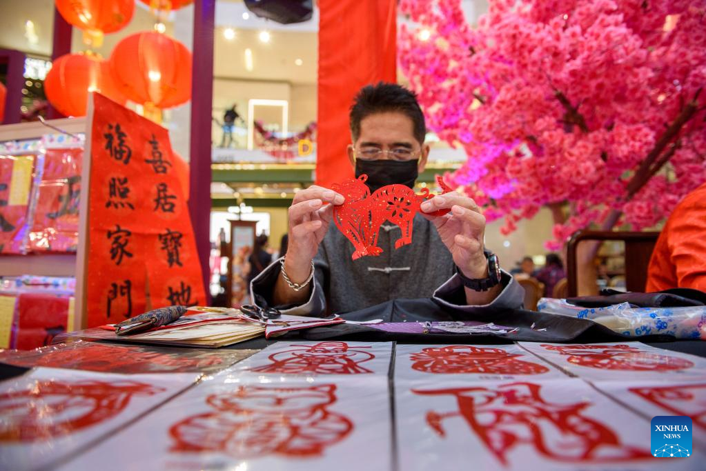 An paper-cut artist shows his work at the Pavilion Paper Art Garden in Kuala Lumpur, Malaysia, Jan. 11, 2022. The Pavilion Paper Art Garden, with splendid traditional Chinese art of paper cutting works, was set in celebrations of the upcoming Chinese New Year. (Photo by Chong Voon Chung/Xinhua)