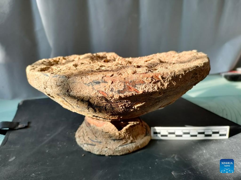 Undated photo shows a piece of pottery found in the Sunjiagang site in Lixian County, central China's Hunan Province. Archaeologists have recently discovered new potteries and stone artifacts from a site dating back between 3,800 to 4,200 years in central China's Hunan Province, said the provincial cultural relics and archaeology research institute. TO GO WITH "Prehistoric relics unearthed in China's Hunan" (Xinhua)