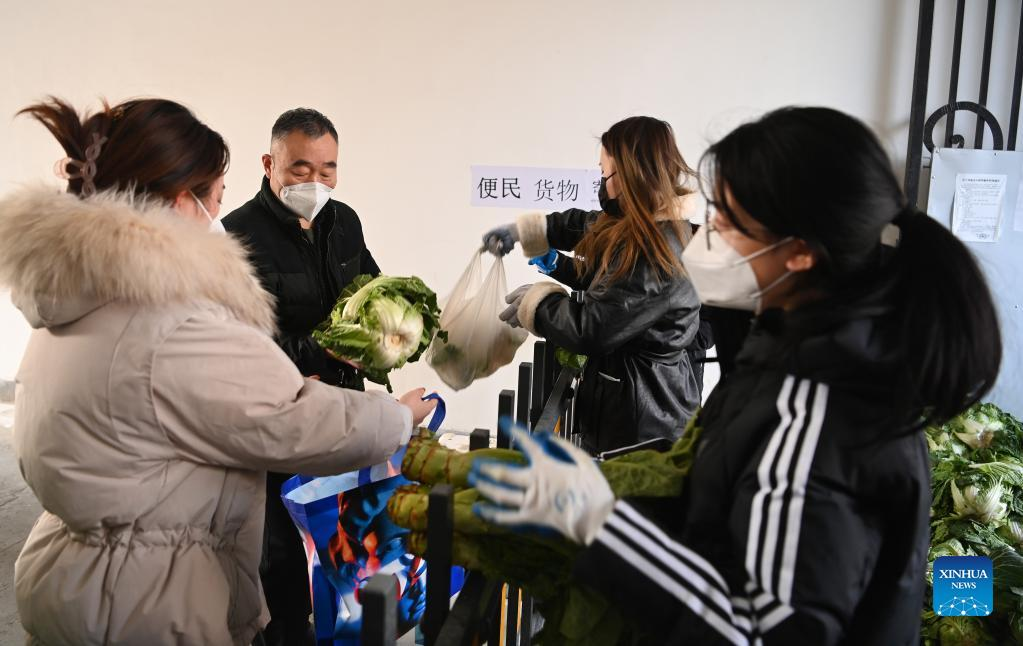 Community staff members send vegetables donated by warm-hearted people to residents in Xi'an, capital of northwest China's Shaanxi Province, Jan. 10, 2022. Local authorities advance the orderly resumption of businesses dealing with the supply of necessities, postal and express delivery services, and the catering industry, amid the latest COVID-19 resurgence. (Xinhua/Tao Ming)