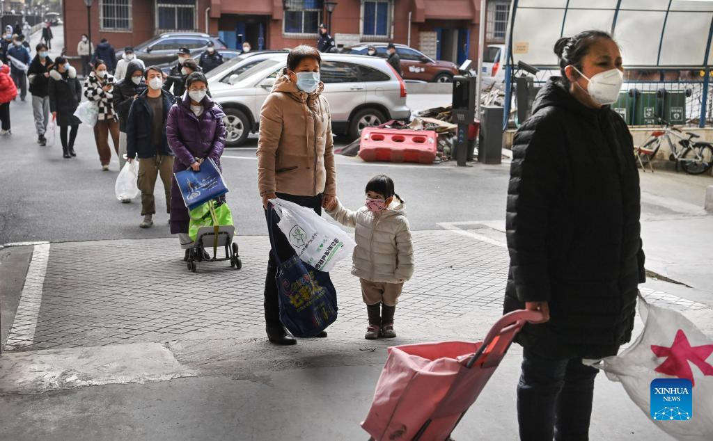 Residents line up to receive the necessities donated by warm-hearted people in Xi'an, capital of northwest China's Shaanxi Province, Jan. 10, 2022. Local authorities advance the orderly resumption of businesses dealing with the supply of necessities, postal and express delivery services, and the catering industry, amid the latest COVID-19 resurgence. (Xinhua/Tao Ming)