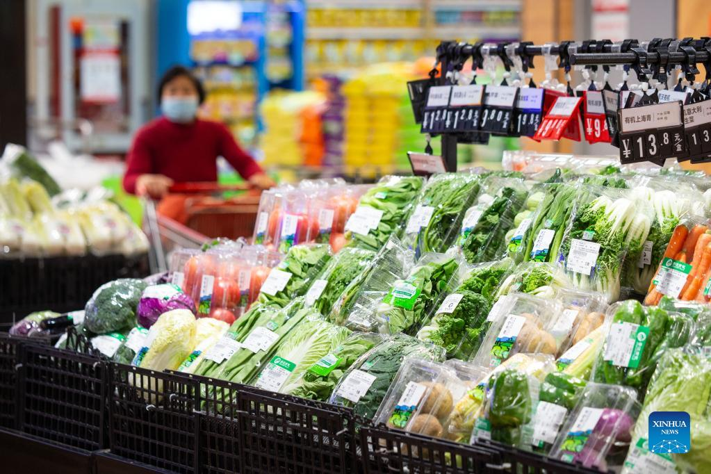 A customer selects vegetables at a market in Wuxi, east China's Jiangsu Province, Jan. 12, 2022. (Photo by Huan Yueliang/Xinhua)