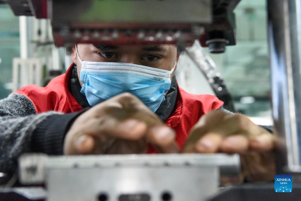 A staff member works in an electronics company at the integrated industrial park in Moyu County of Hotan, northwest China's Xinjiang Uygur Autonomous Region, Jan. 11, 2022. Located on the southern brim of the Taklimakan Desert, Moyu was once an impoverished county with little arable land and weak industrial foundation. In recent years, Moyu County made efforts to attract investment as the booster of industrial development, constantly optimizes the industrial structure, and builds an integrated industrial park with the whole industrial chain of hosiery and electronics, effectively promoting economic development and increasing the income of local people. Up to now, the integrated industrial park in Moyu County has settled 17 enterprises and has offered more than 3,000 jobs. (Xinhua/Ding Lei)