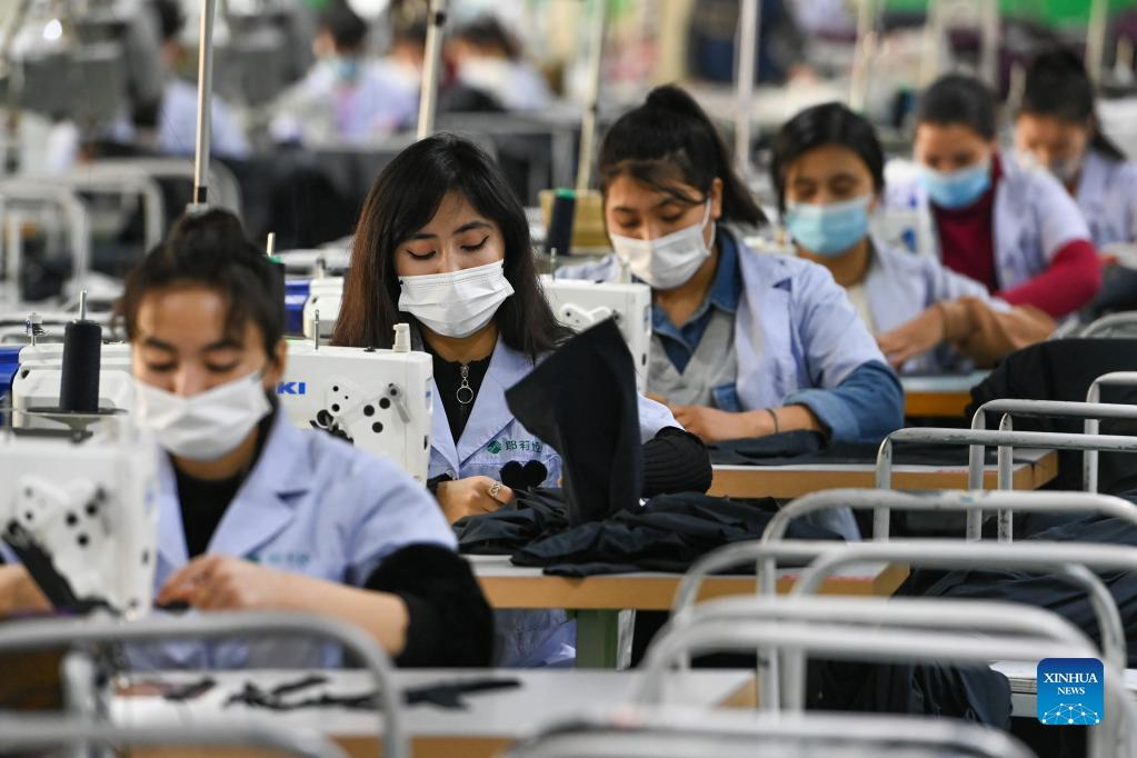 Staff members work in a clothing factory at the integrated industrial park in Moyu County of Hotan, northwest China's Xinjiang Uygur Autonomous Region, Jan. 11, 2022. Located on the southern brim of the Taklimakan Desert, Moyu was once an impoverished county with little arable land and weak industrial foundation. In recent years, Moyu County made efforts to attract investment as the booster of industrial development, constantly optimizes the industrial structure, and builds an integrated industrial park with the whole industrial chain of hosiery and electronics, effectively promoting economic development and increasing the income of local people. Up to now, the integrated industrial park in Moyu County has settled 17 enterprises and has offered more than 3,000 jobs. (Xinhua/Ding Lei)