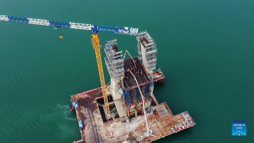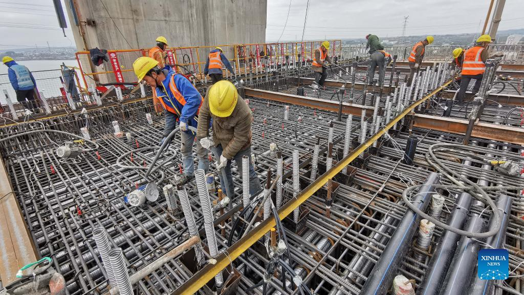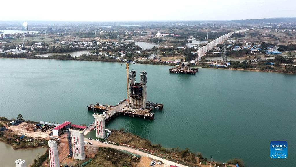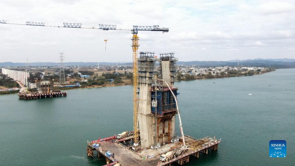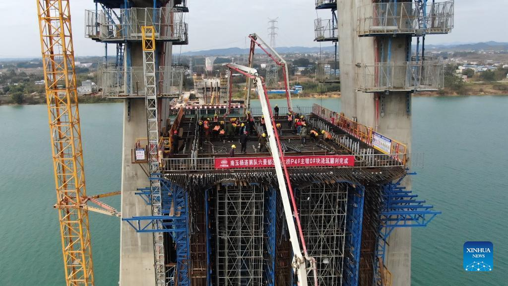 Workers are seen at the construction site of the high-speed railway linking Nanning and Yulin of south China's Guangxi Zhuang Autonomous Region, Jan. 11, 2022. (Xinhua/Zhang Ailin)