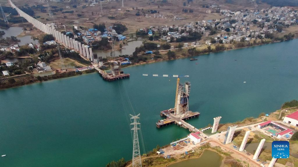 Aerial photo taken on Jan. 11, 2022 shows the construction site of the high-speed railway linking Nanning and Yulin of south China's Guangxi Zhuang Autonomous Region. (Xinhua/Zhang Ailin)