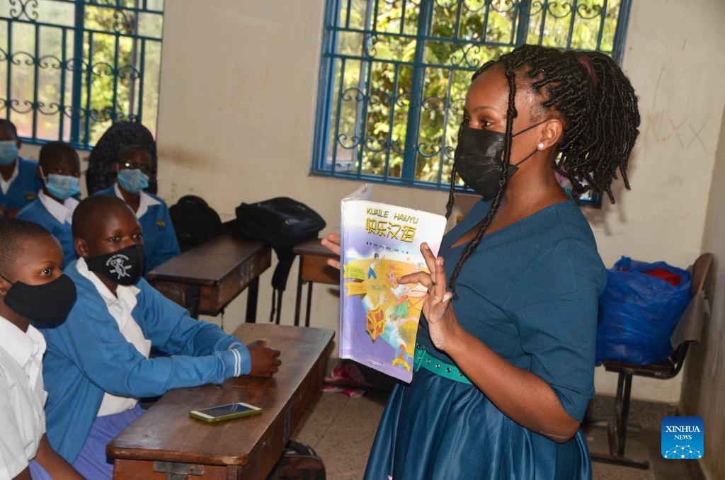 Teacher Hilda Ayebare gives lessons on the first day of reopening of the Chinese classes after six months of closure due to the COVID-19 pandemic, at Ndejje secondary school in Luwero district, Central Region, Uganda, Jan. 11, 2022. (Photo by Nicholas Kajoba/Xinhua)