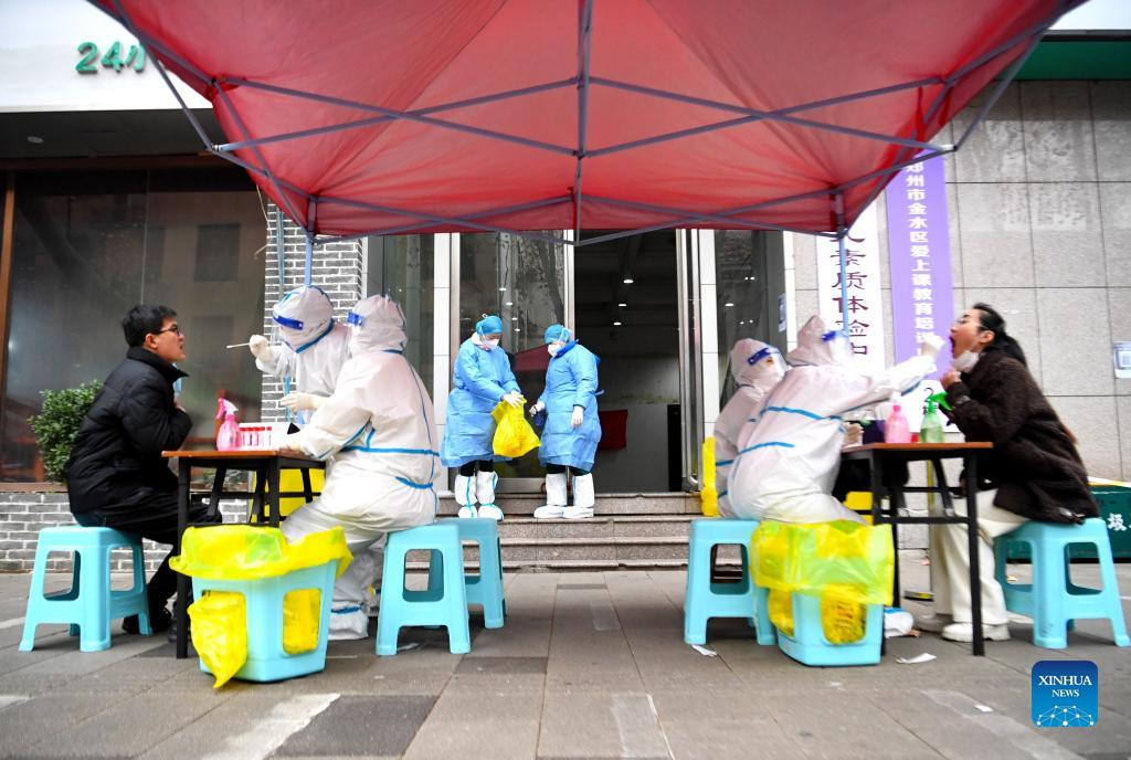 Medical workers take swab samples from citizens for nucleic acid test at a COVID-19 testing site in Zhengzhou, central China's Henan Province, Jan. 10, 2022. Henan on Sunday reported 60 new locally transmitted COVID-19 cases, the National Health Commission said in its daily report on Monday. (Xinhua/Hao Yuan)