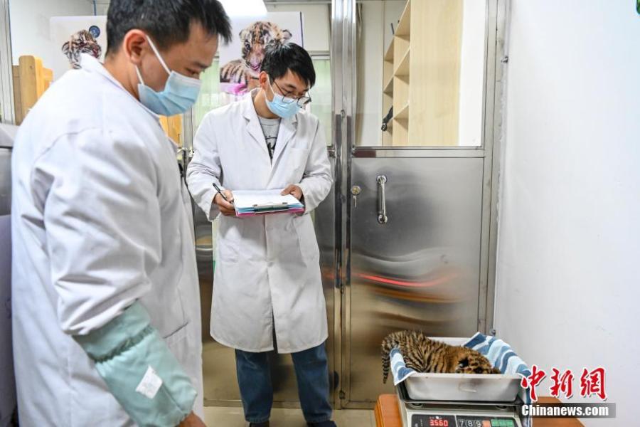 Care workers weigh one cub, January 12, 2022. (Photo: China News Service/Chen Jimin)
