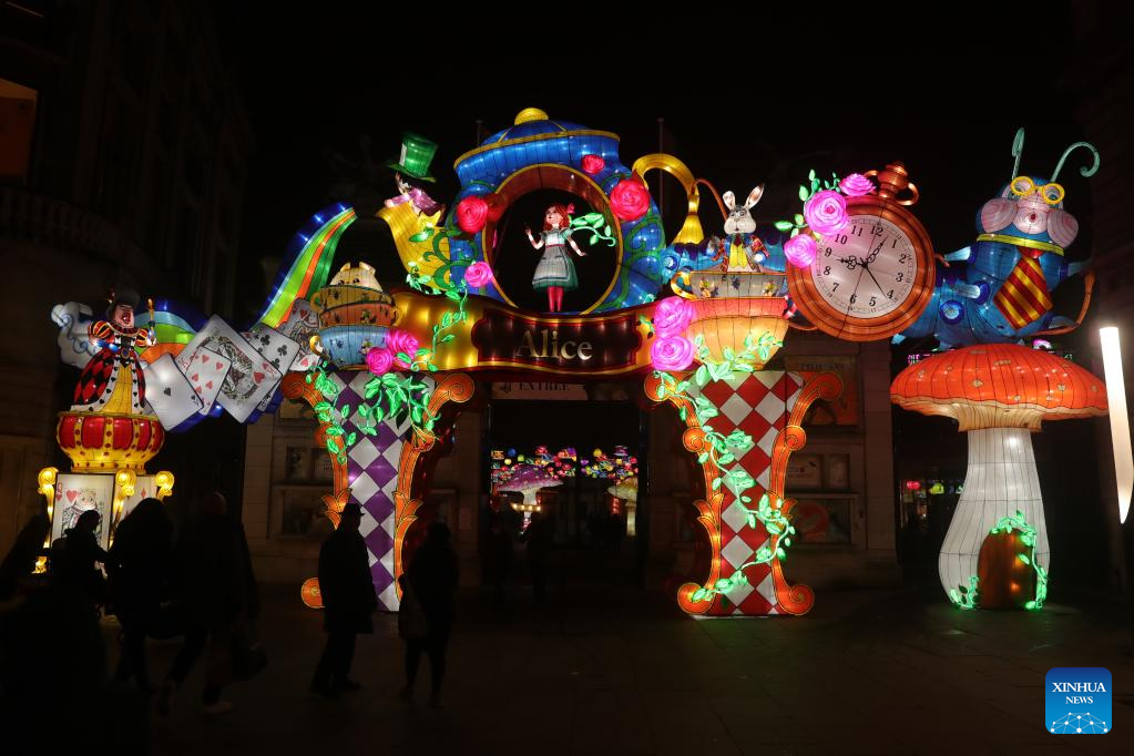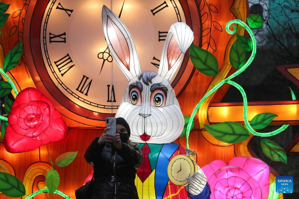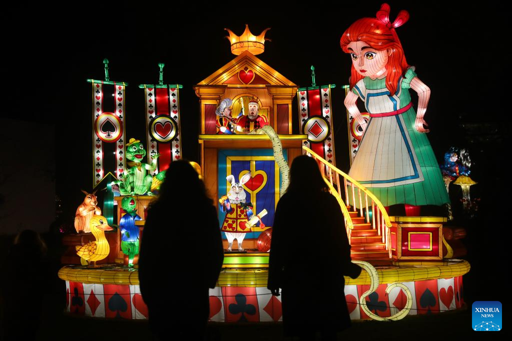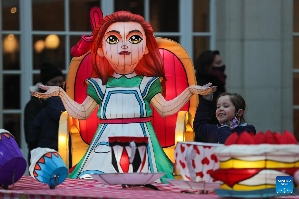 A light installation is pictured during the sixth edition of China light festival themed "Alice in Wonderland" at the Antwerp Zoo in Antwerp, Belgium, Jan. 12, 2022. (Xinhua/Zheng Huansong)