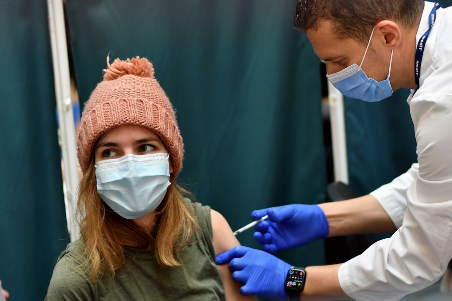 A woman receives a dose of COVID-19 vaccine at a vaccination point of a shopping mall in Sarajevo, Bosnia and Herzegovina, Jan. 8, 2022. (Photo by Nedim Grabovica/Xinhua)