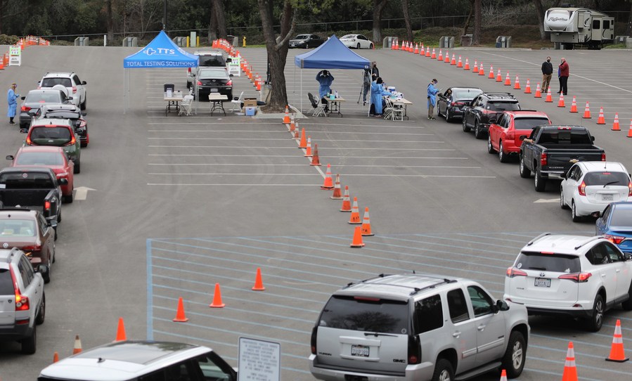 Vehicles line up at a COVID-19 drive-through testing site in Los Angeles, California, the United States, Jan. 10, 2022. (Xinhua)