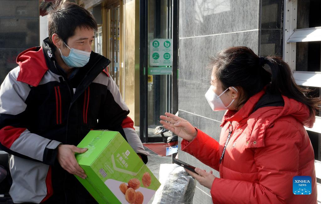 Courier Zhu Wenjun (L) talks with a customer in Xi'an, capital of northwest China's Shaanxi Province, Jan. 13, 2022. Postal and express delivery services in Xi'an have been gradually resumed in an orderly manner with strengthened epidemic prevention measures amid the latest resurgence. (Photo by Zou Jingyi/Xinhua)