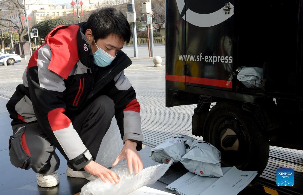 Courier Zhu Wenjun packs a parcel in Xi'an, capital of northwest China's Shaanxi Province, Jan. 13, 2022. Postal and express delivery services in Xi'an have been gradually resumed in an orderly manner with strengthened epidemic prevention measures amid the latest resurgence. (Photo by Zou Jingyi/Xinhua)