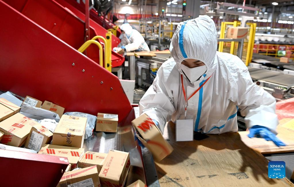 Staff members sort packages at a logistics center in Xi'an, capital of northwest China's Shaanxi Province, Jan. 13, 2022. Postal and express delivery services in Xi'an have been gradually resumed in an orderly manner with strengthened epidemic prevention measures amid the latest resurgence. (Xinhua/Liu Xiao)
