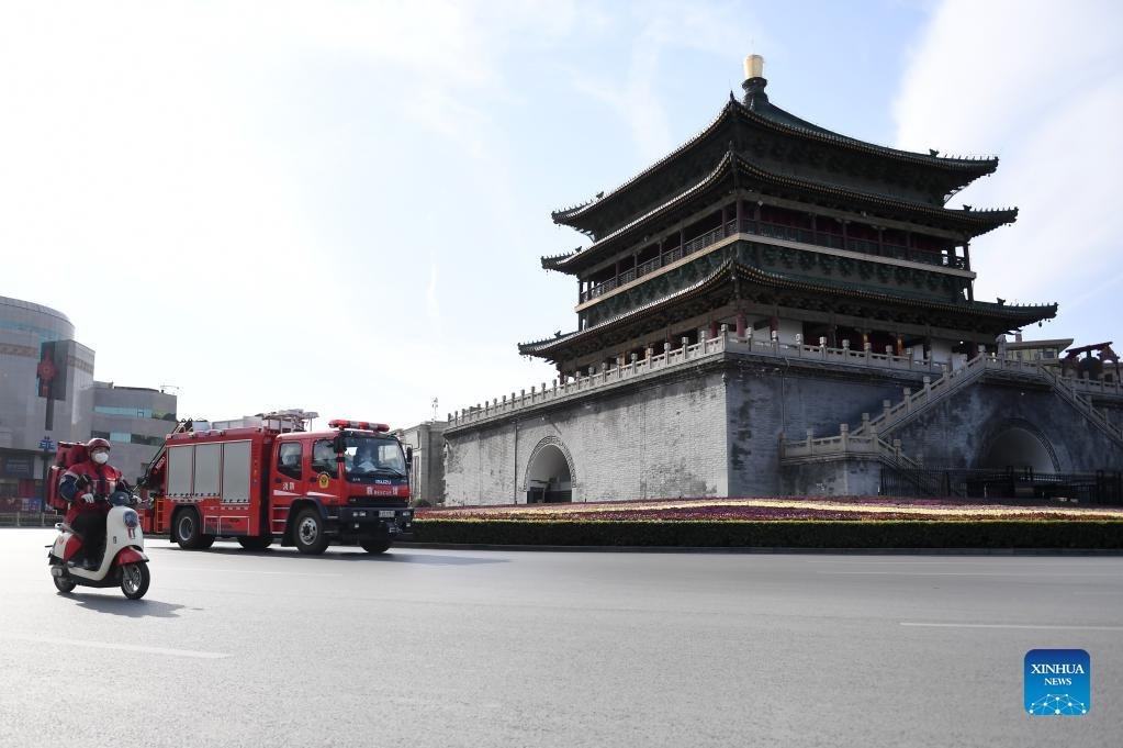 A delivery man rides past the Bell Tower while delivering food to customers in Xi'an, capital of northwest China's Shaanxi Province, Jan. 13, 2022. Local authorities advance the orderly resumption of catering service as the city is witnessing a continuing drop of local COVID-19 cases amid the latest resurgence. Catering enterprises will receive take-out orders with COVID-19 prevention measures but dine-in services will remain suspended. (Xinhua/Li Yibo)