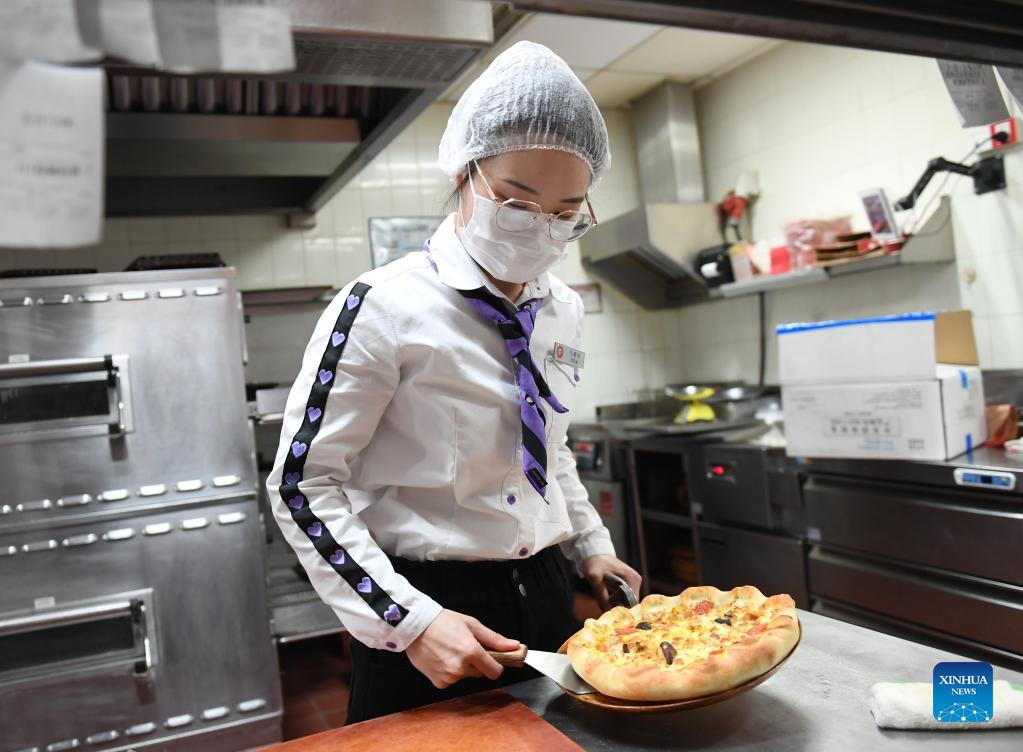 A staff member makes takeout food at a restaurant in Xi'an, capital of northwest China's Shaanxi Province, Jan. 13, 2022. Local authorities advance the orderly resumption of catering service as the city is witnessing a continuing drop of local COVID-19 cases amid the latest resurgence. Catering enterprises will receive take-out orders with COVID-19 prevention measures but dine-in services will remain suspended. (Xinhua/Li Yibo)
