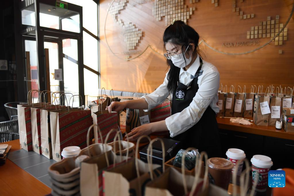 A staff member arranges takeout coffees at a coffee shop in Xi'an, capital of northwest China's Shaanxi Province, Jan. 13, 2022. Local authorities advance the orderly resumption of catering service as the city is witnessing a continuing drop of local COVID-19 cases amid the latest resurgence. Catering enterprises will receive take-out orders with COVID-19 prevention measures but dine-in services will remain suspended. (Xinhua/Li Yibo)