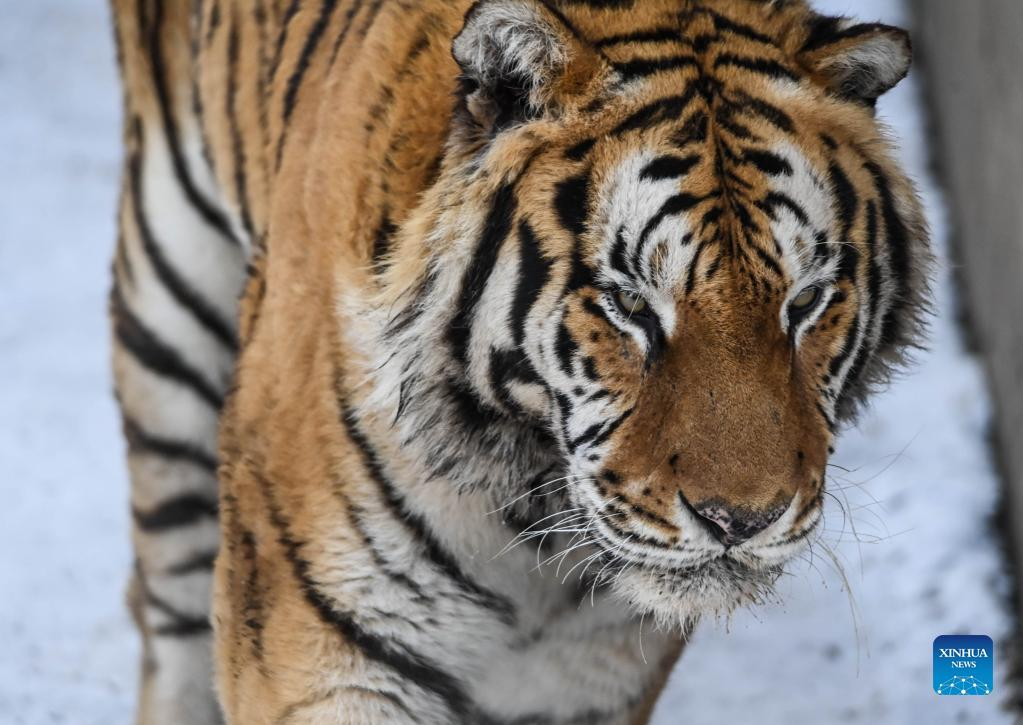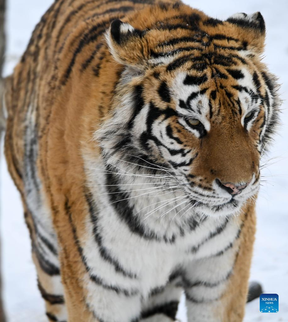A Siberian tiger walks at the Siberian Tiger Park in Changchun City, capital of northeast China's Jilin Province, Jan. 13, 2022. (Xinhua/Yan Linyun)