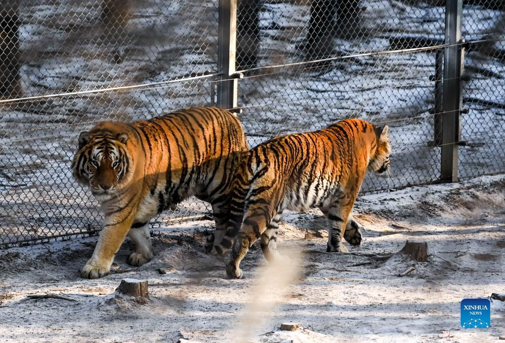 Siberian tigers walk at the Siberian Tiger Park in Changchun City, capital of northeast China's Jilin Province, Jan. 13, 2022. (Xinhua/Yan Linyun)