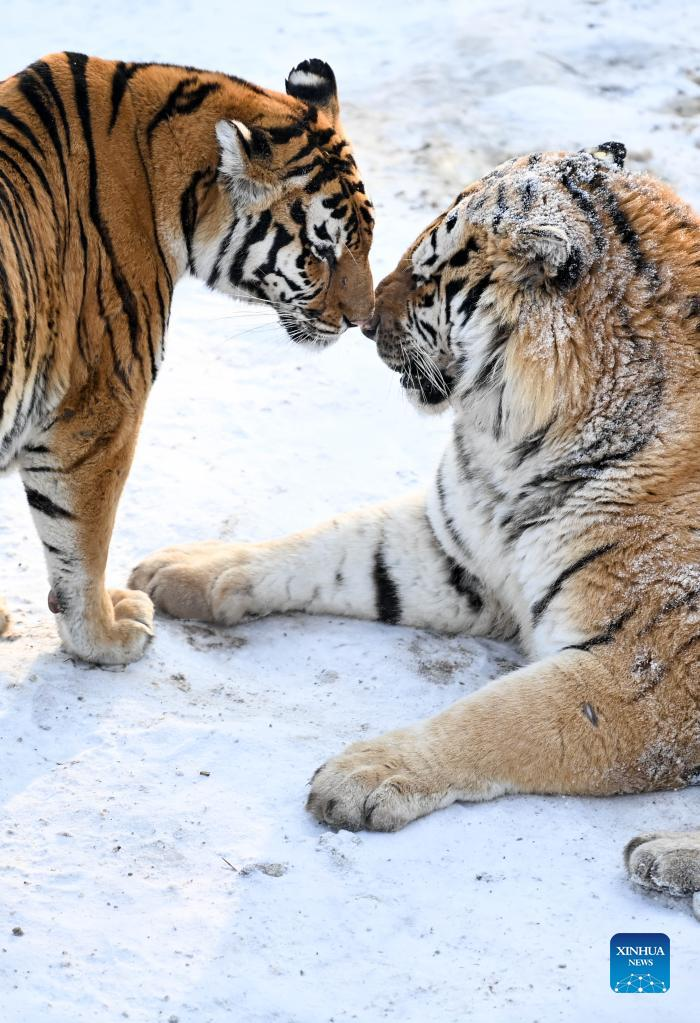 Siberian tigers frolic at the Siberian Tiger Park in Changchun City, capital of northeast China's Jilin Province, Jan. 13, 2022. (Xinhua/Yan Linyun)