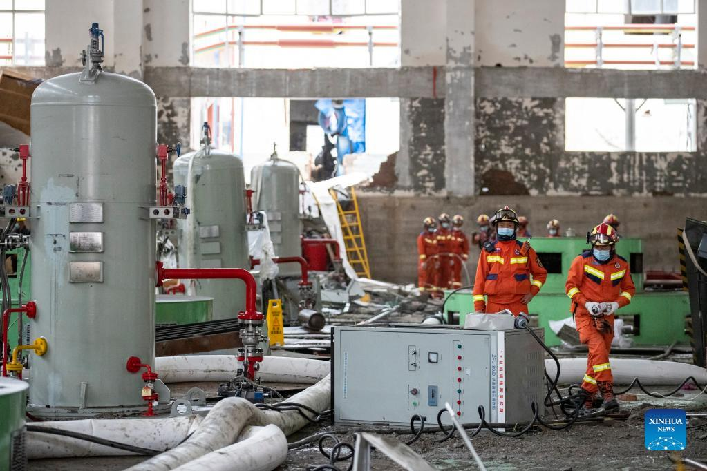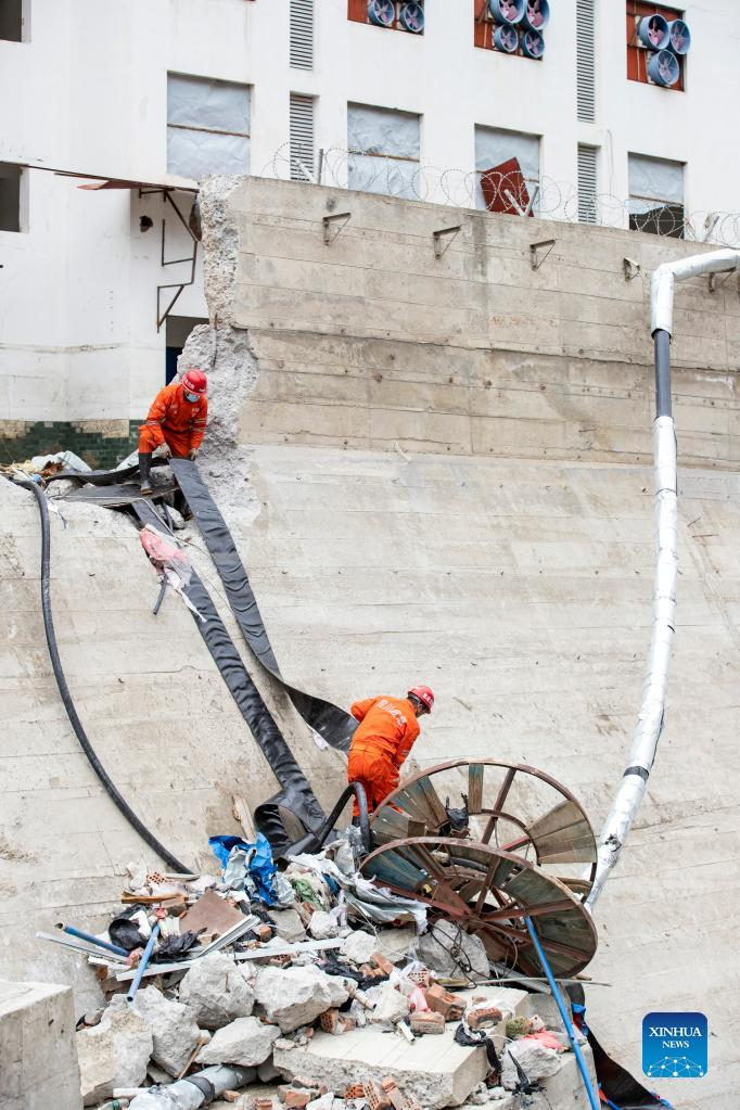 Rescuers work at a building of a power station after a flooding accident in Ganzi Tibetan Autonomous Prefecture, southwest China's Sichuan Province, Jan. 13, 2022. (Xinhua/Shen Bohan)