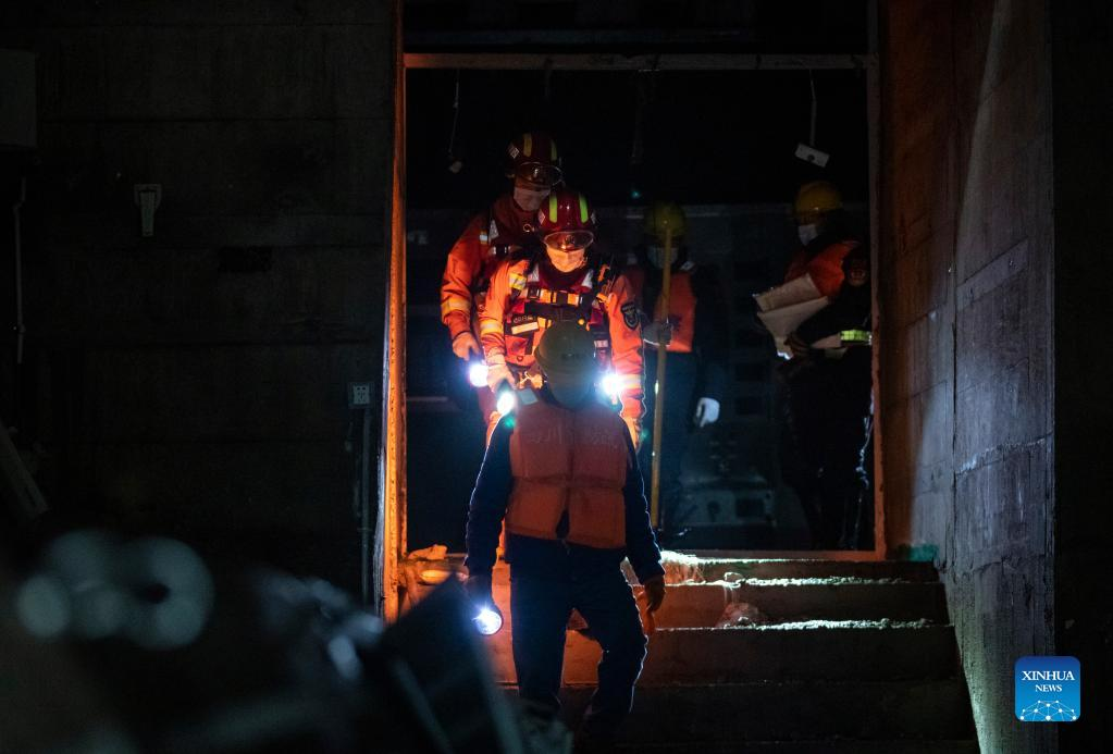 Rescuers prepare to drain water from a building of a power station after a flooding accident in Ganzi Tibetan Autonomous Prefecture, southwest China's Sichuan Province, Jan. 13, 2022. (Xinhua/Shen Bohan)