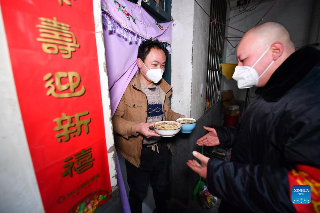 Villager Yang Guang (R), a house owner, delivers lunch to a migrant worker who lives in his house in Sanjia Village of Baqiao District in Xi'an, capital of northwest China's Shaanxi Province, Jan. 12, 2022. Located in Baqiao District of Xi'an, Sanjia Village is an "urban village" inhabited by floating population such as migrant workers. An activity organized to provide two meals for free to residents in need was carried out in the village after the city has been hit by the recent COVID-19 resurgence. (Xinhua/Zhang Bowen)