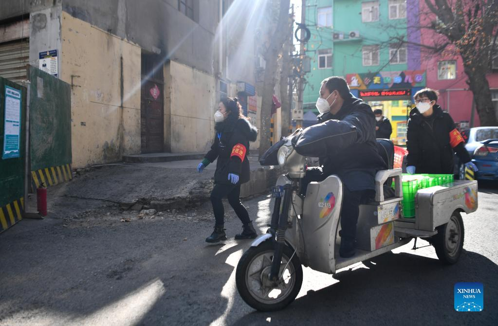 Staff members deliver lunch to residents in Sanjia Village of Baqiao District in Xi'an, capital of northwest China's Shaanxi Province, Jan. 12, 2022. Located in Baqiao District of Xi'an, Sanjia Village is an "urban village" inhabited by floating population such as migrant workers. An activity organized to provide two meals for free to residents in need was carried out in the village after the city has been hit by the recent COVID-19 resurgence. (Xinhua/Zhang Bowen)