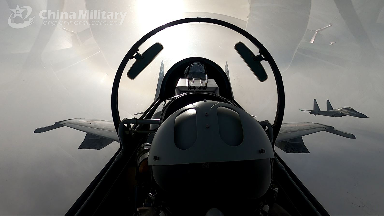 A fighter jet attached to an aviation brigade of the air force under the PLA Western Theater Command flies almost in line abreast above the clouds with its wing-man during a live-fire air battle training exercise on January 7, 2022, which aims to beef up the pilots’ air combat capability. (eng.chinamil.com.cn/Photo by Zhao Tian)
