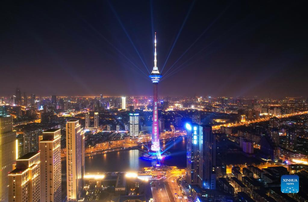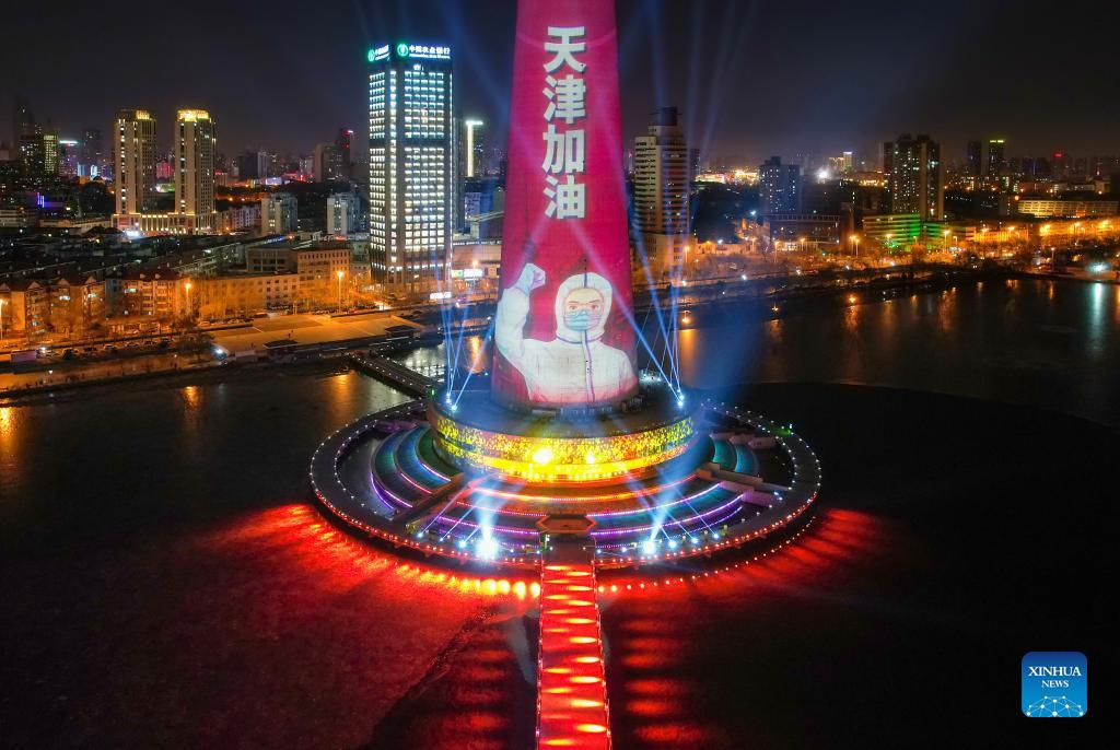 Aerial photo shows a landmark lit up to pay tribute to people making efforts to fight against the recent resurgence of COVID-19 pandemic in north China's Tianjin, Jan. 13, 2022. (Xinhua)