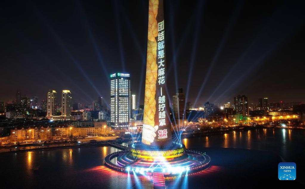 Landmark in Tianjin lit up to pay tribute to people fighting against COVID-19